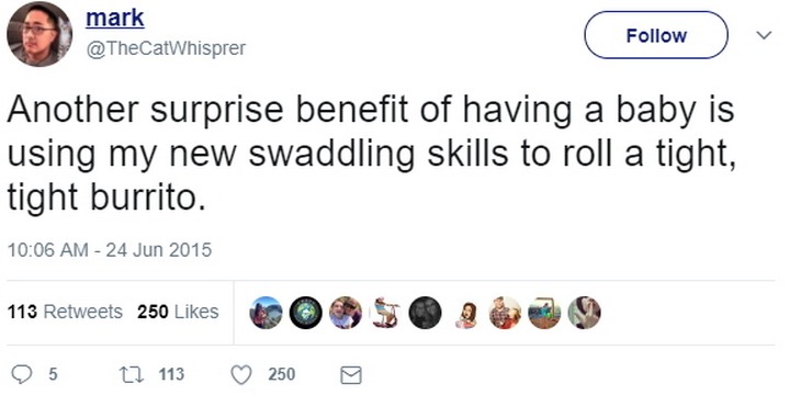 “Another surprise benefit of having a baby is using my new swaddling skills to roll a tight, tight burrito.”