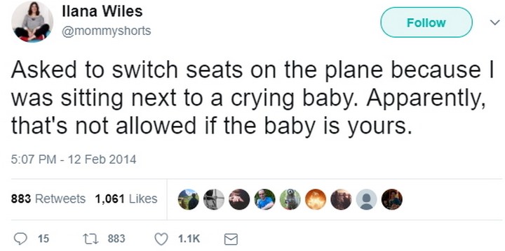 “Asked to switch seats on the plane because I was sitting next to a crying baby. Apparently, that’s not allowed if the baby is yours.”
