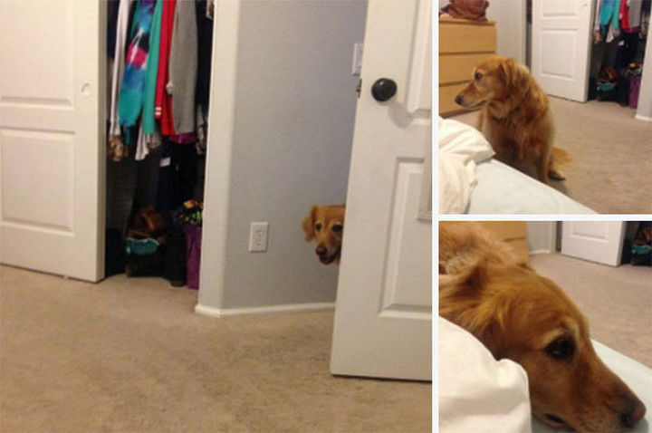 27) She’s not allowed in the bedroom but she’s thinking “if I don’t look at my human, she won’t see me right?” Wrong. 🙂