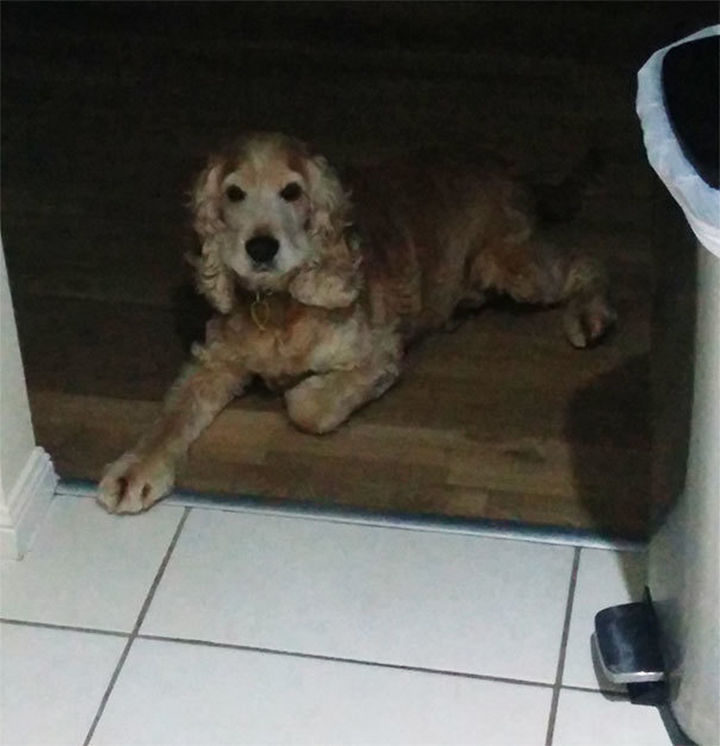 6) This 12-year-old pooch isn’t allowed in the kitchen so he likes to get as close as he can.