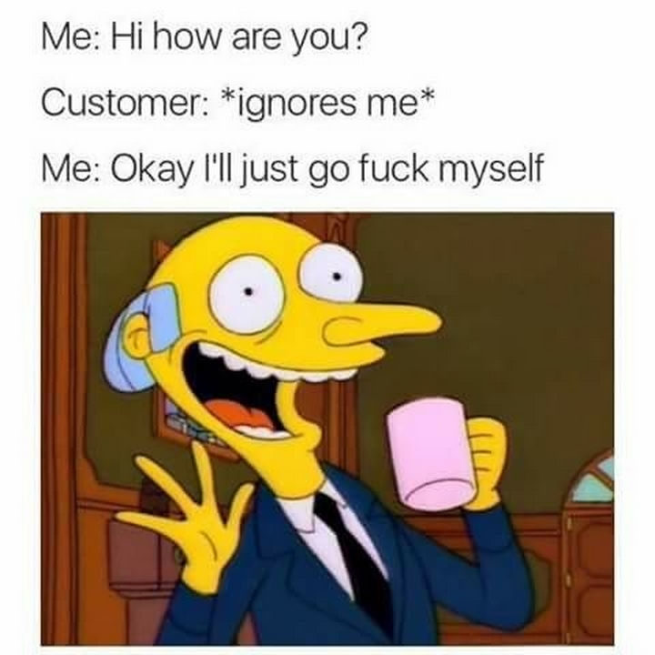 “Me: Hi, how are you? Customer: *ignores me*. Me: Okay, I’ll just go f*** myself.”
