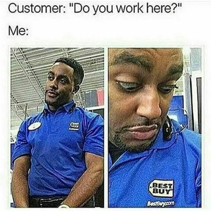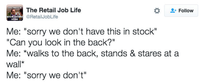 “Me: ‘sorry, we don’t have this in stock.’ Customer: ‘Can you look in the back?’ Me: *walks to the back, stands & stares at a wall* Me: ‘Sorry, we don’t.'”