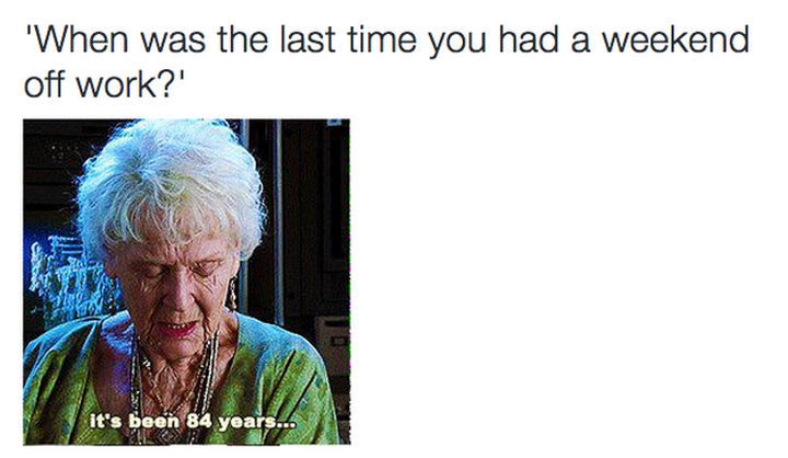 “When was the last time you had a weekend off work? It’s been 84 years…”