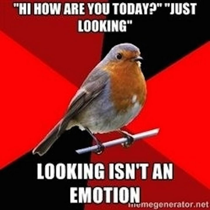 “Hi, how are you today? Just looking. Looking isn’t an emotion.”