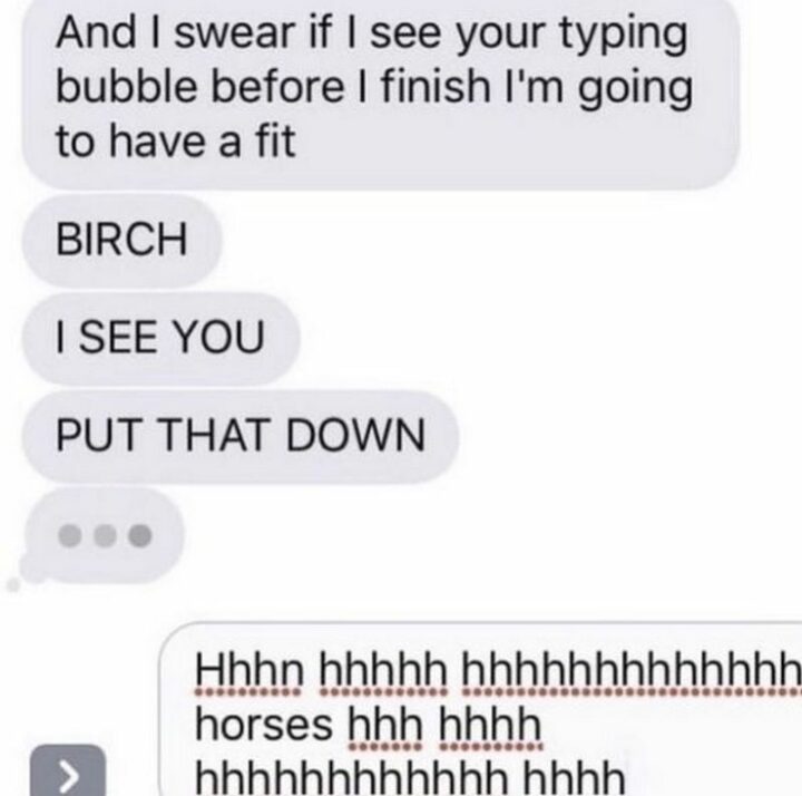 2) “And I swear if I see your typing bubble before I finish I’m going to have a fit. Birch, I see you. Put that down.”