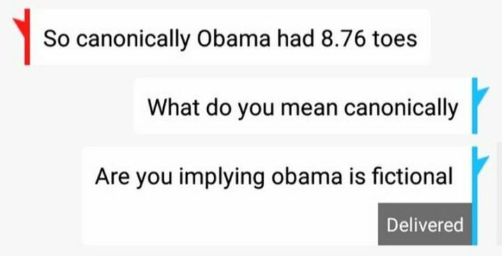 5) “So canonically Obama had 8.76 toes. What do you mean canonically? Are you implying Obama is fictional?”