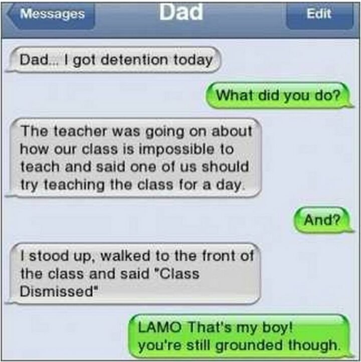 7) “Dad…I got detention today. What did you do? The teacher was going on about how our class is impossible to teach and said one of us should try teaching the class for a day. And? I stood up, walked to the front of the class, and said ‘Class dismissed.’ LAMO That’s my boy! You’re still grounded though.”