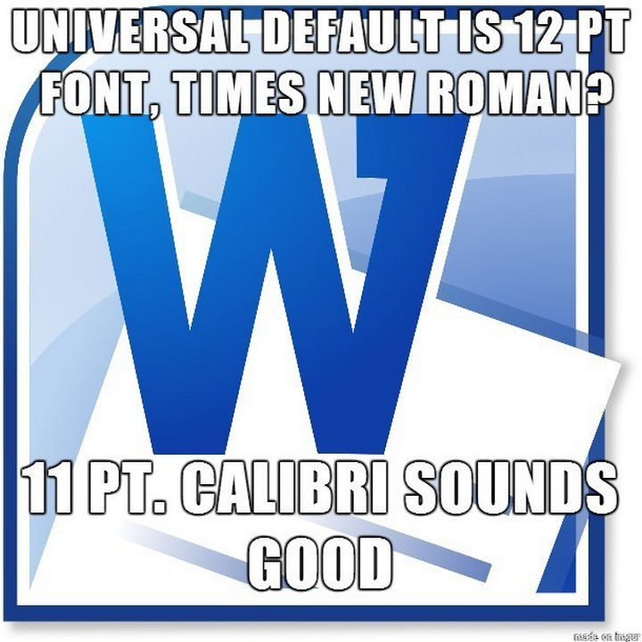 “Universal default is 12pt. font, times new roman? 11pt. Calibri sounds good.”