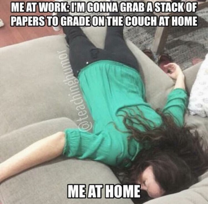 “Me at work: I’m gonna grab a stack of papers to grade on the couch at home. Me at home.”