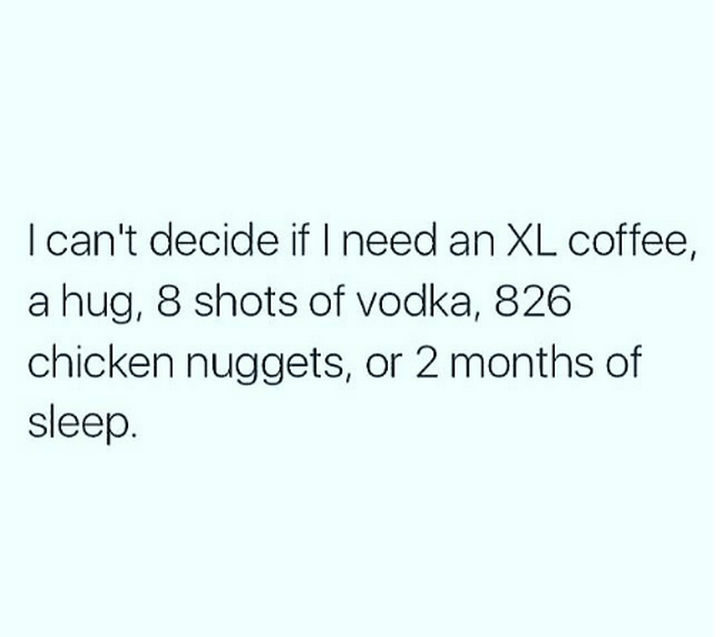 “I can’t decide if I need an XL coffee, a hug, 8 shots of vodka, 826 chicken nuggets, or 2 months of sleep.”