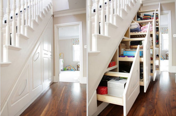 1) Home improvement ideas to reclaim the space under your staircase and build drawers for extra storage.