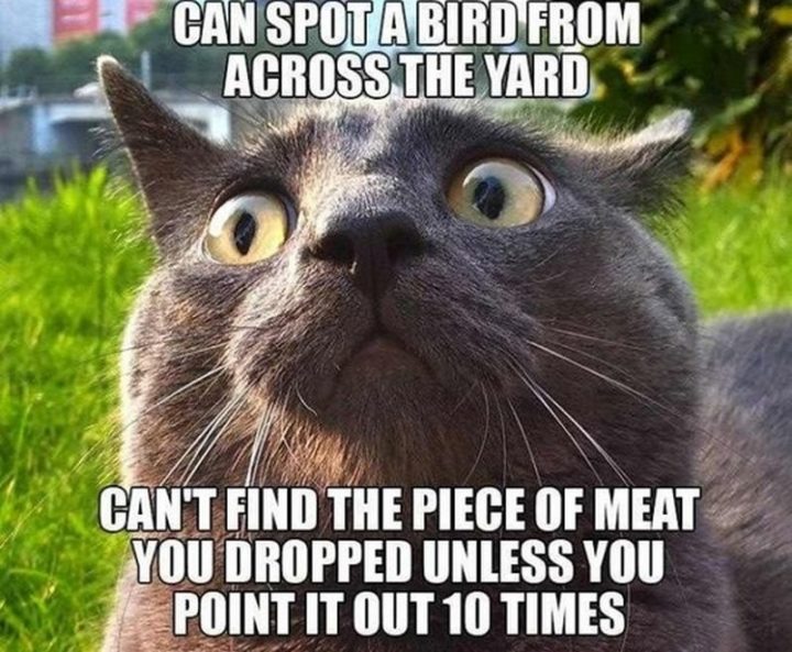 “Can spot a bird from across the yard. Can’t find the piece of meat you dropped unless you point it out 10 times.”