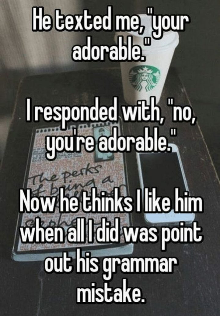 “He texted me, ‘your adorable’. I responded with, ‘no, you’re adorable’. Now he thinks I like him when all I did was point out his grammar mistake.”