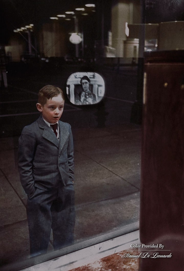 58) A young boy seeing a television for the first time.