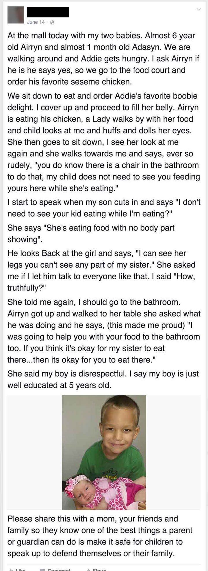 The following Facebook post has gone viral because it raises the public breastfeeding issue once more but it’s a particular 6-year-old that is the star. He has the most epic response for someone who got offended by his mother breastfeeding his baby sister in a food court.