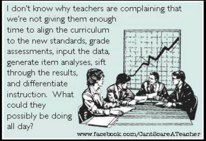 “I don’t know why teachers are complaining that we’re not giving them enough time to align the curriculum to the new standards, input the data, generate item analyses, sift through the results, and differentiate instruction. What could they possibly be doing all day?”