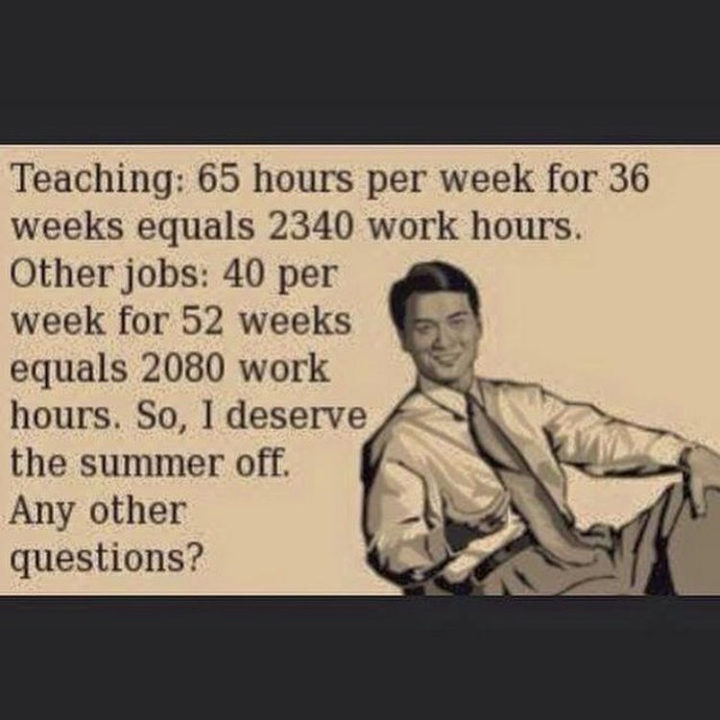 “Teaching: 65 hours per week for 36 weeks equals 2340 work hours. Other jobs: 40 per week for 52 weeks equals 2080 work hours. So, I deserve the summer off. Any other questions?”
