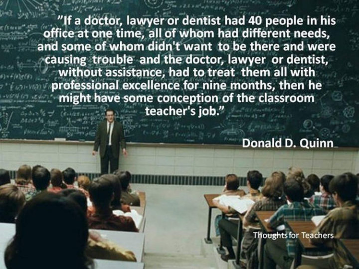 “If a doctor, lawyer or dentist had 40 people in his office at one time, all of whom had different needs, and some of whom didn’t want to be there and were causing trouble, and the doctor, lawyer or dentist, without assistance, had to treat them all with professional excellence for nine months, then he might have some conception of the classroom teacher’s job.”