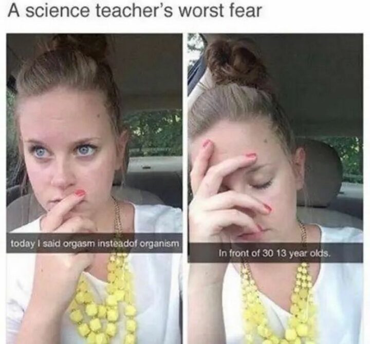 “A science teacher’s worst fear: Today I said orgasm instead of an organism in front of 30 13-year-olds.”