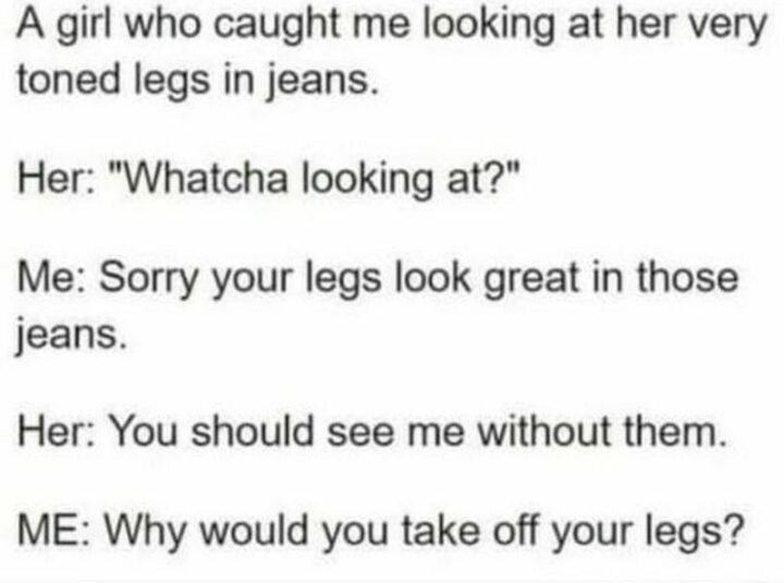 “A girl who caught me looking at her very toned legs in jeans. Her: Whatcha looking at? Me: Sorry your legs look great in those jeans. Her: You should see me without them. Me: Why would you take off your legs?”