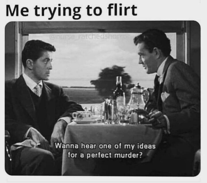 “Me trying to flirt: Wanna hear one of my ideas for a perfect murder?”