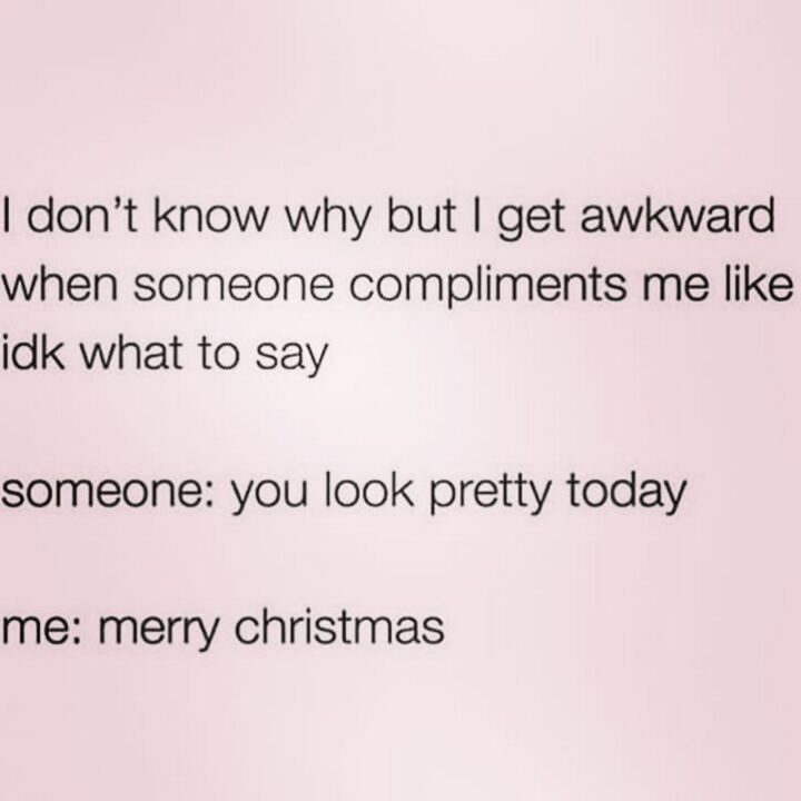 “I don’t know why but I get awkward when someone compliments me like I don’t know what to say. Someone: You look pretty today. Me: Merry Christmas.”