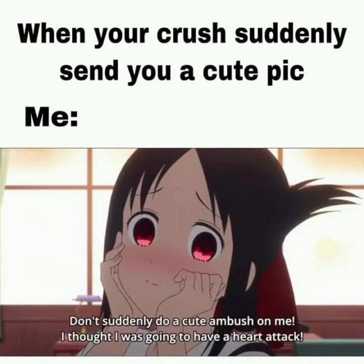 “When your crush suddenly sends you a cute pic. Me: Don’t suddenly do a cute ambush on me! I thought I was going to have a heart attack!”