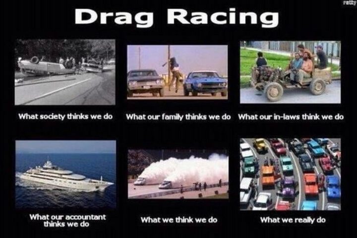 “Drag racing. What society thinks we do. What our family thinks we do. What our in-laws think we do. What our accountant thinks we do. What we think we do. What we really do.”