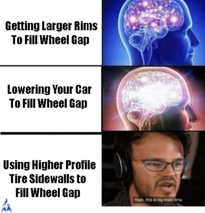 “Getting larger rims to fill the wheel gap. Lowering your car to fill the wheel gap. Using higher profile tire sidewalls to fill the wheel gap. Yeah, this is big brain time.”
