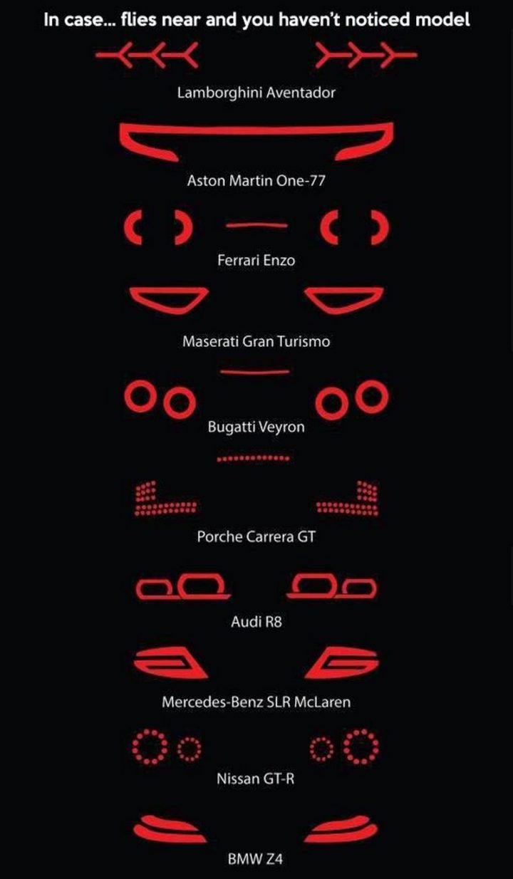 “In case…flies near at night and you haven’t noticed model. Lamborghini Aventador. Aston Martin One-77. Ferrari Enzo. Maserati Gran Turismo. Bugatti Veyron. Porche Carrera GT. Audi R8. Mercedes-Benz SLR McLaren. Nissan GT-R. BMW Z4.”
