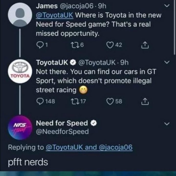 “James: Where is Toyota in the new Need for Speed game? That’s a real missed opportunity. Toyota: Not there. You can find our cars in GT Sport, which doesn’t promote illegal street racing. Need for Speed: pfft nerds.”