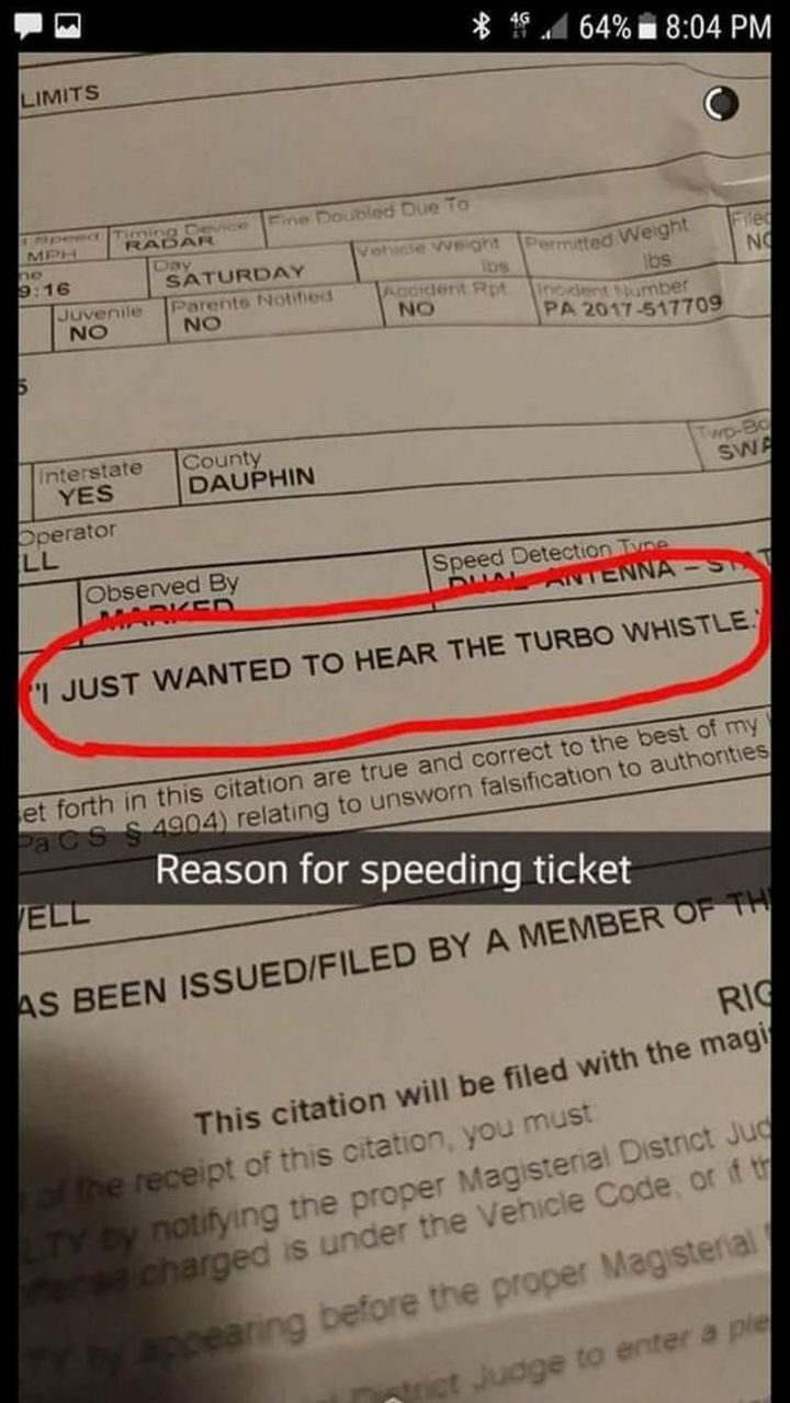 “Reason for speeding ticket: I just wanted to hear the turbo whistle.”
