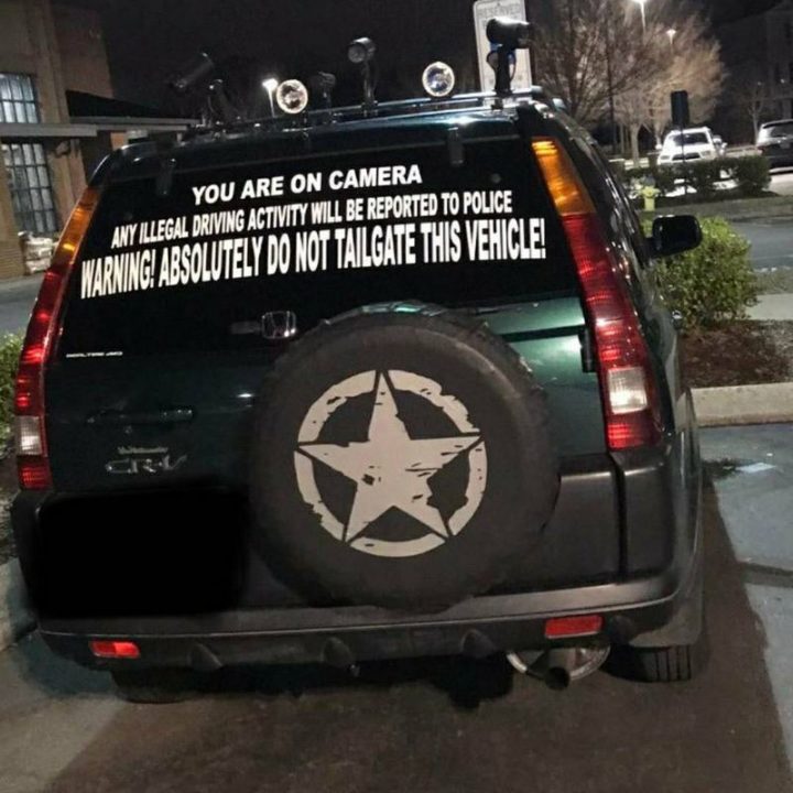 “You are on camera. Any illegal driving activity will be reported to the police. Warning! Absolutely do not tailgate this vehicle!”