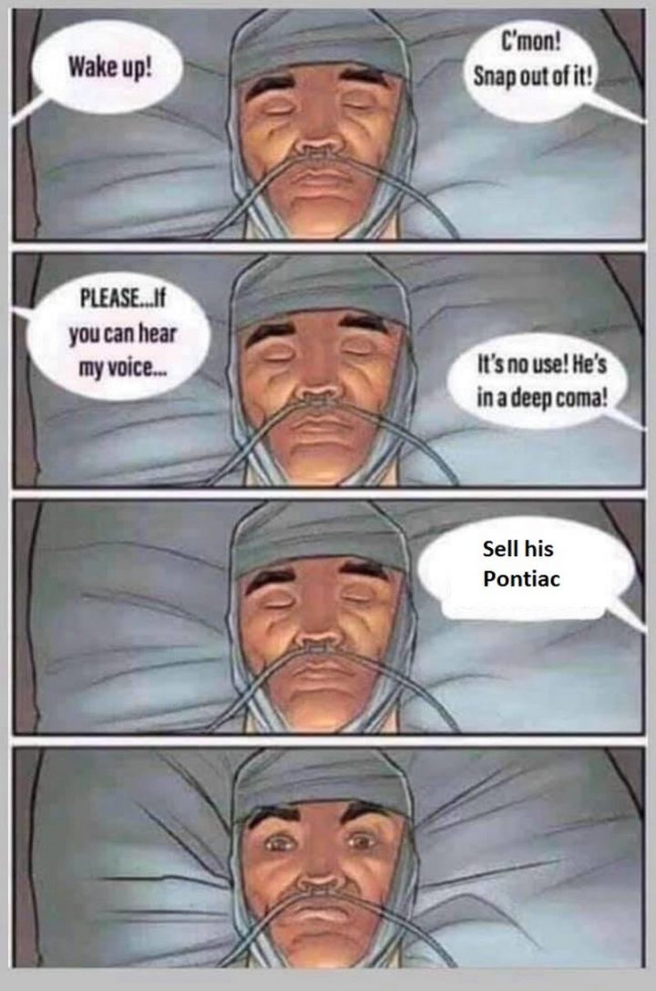“Wake up! C’mon! Snap out of it! Please…If you can hear my voice...It’s no use! He’s in a deep coma! Sell his Pontiac.”