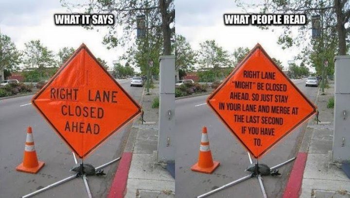“What it says: Right lane closed ahead. What people read: Right lane might be closed ahead so just stay in your lane and merge at the last second if you have to.”