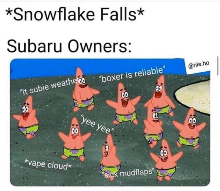 “*Snowflake falls* Subaru owners: It subie weather. Boxer is reliable. Yee yee. Vape cloud. Sick mudflaps.”