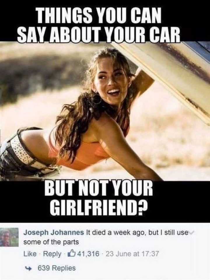 “Things you can say about your car but not your girlfriend? It died a week ago, but I still use some of the parts.”