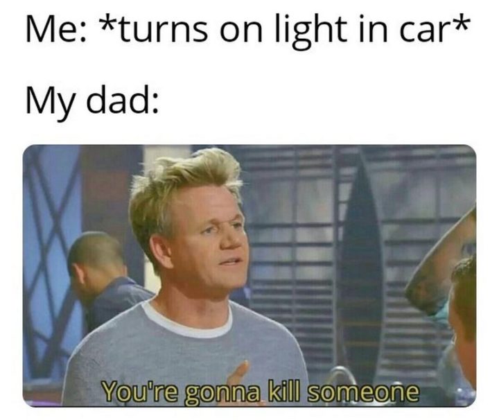 “Me: *turns on the light in car* My dad: You’re gonna kill someone.”