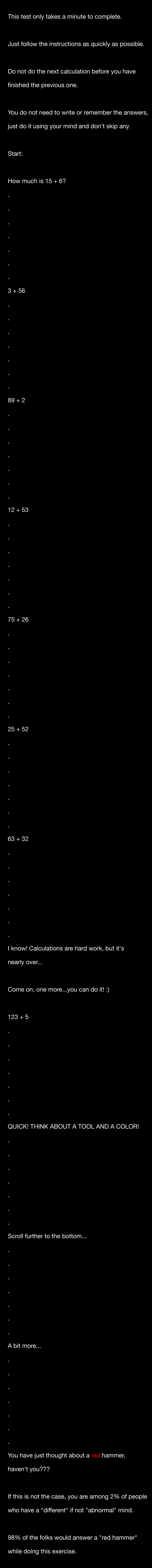 Math puzzles or quizzes can be intriguing for a variety of reasons. For one, they often require logical reasoning and critical thinking, which can be mentally stimulating and satisfying to solve. Additionally, the challenge of trying to solve a difficult problem can be rewarding and provide a sense of accomplishment. But in this case, the “red hammer” trick is somewhat mesmerizing because it boggles the mind knowing that most people choose a red hammer!