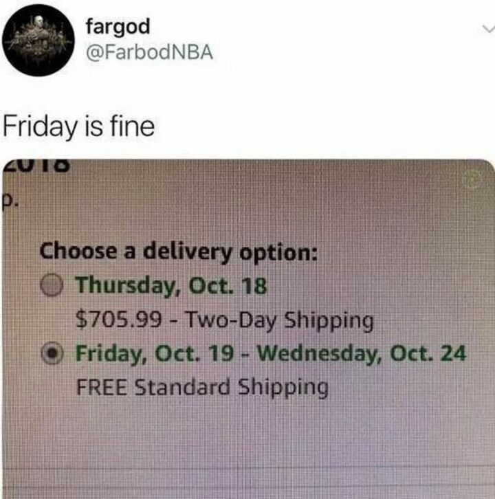 “Me: *orders something with same-day delivery on 11:59* Amazon: Amazon Prime.”