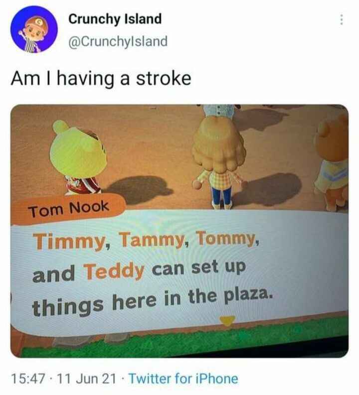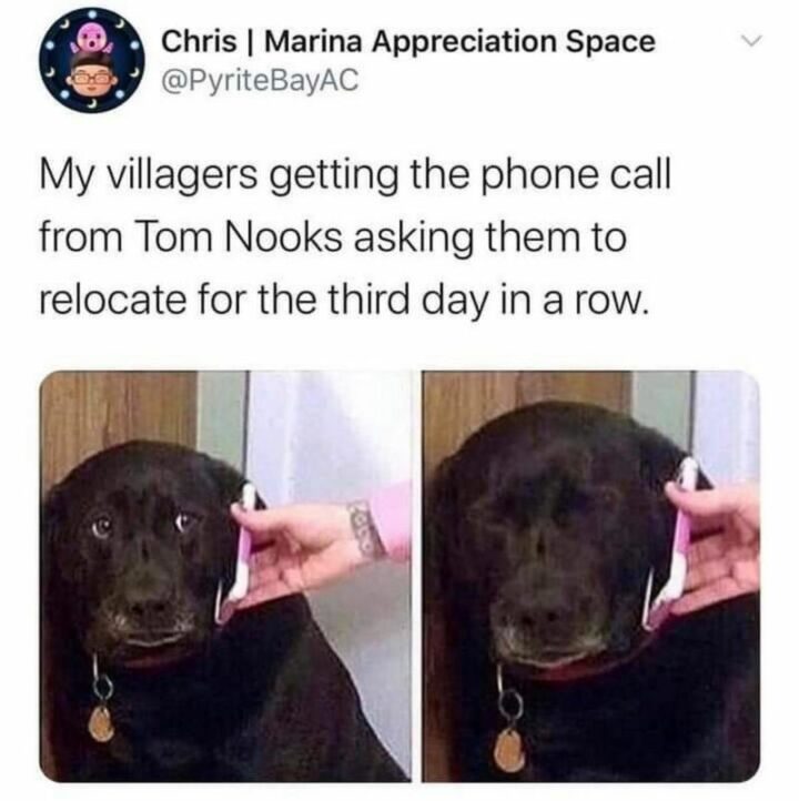 37) “My villagers getting the phone call from Tom Nooks asking them to relocate for the third date in a row.”