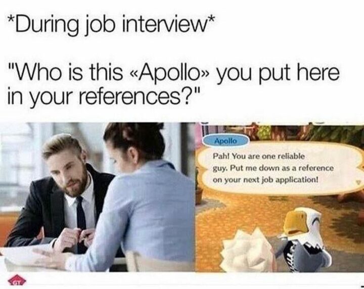 14) “*During job interview* Who is this Apollo you put here in your references? Apollo: Pah! You are one reliable guy. Put me down as a reference on your next job application!”