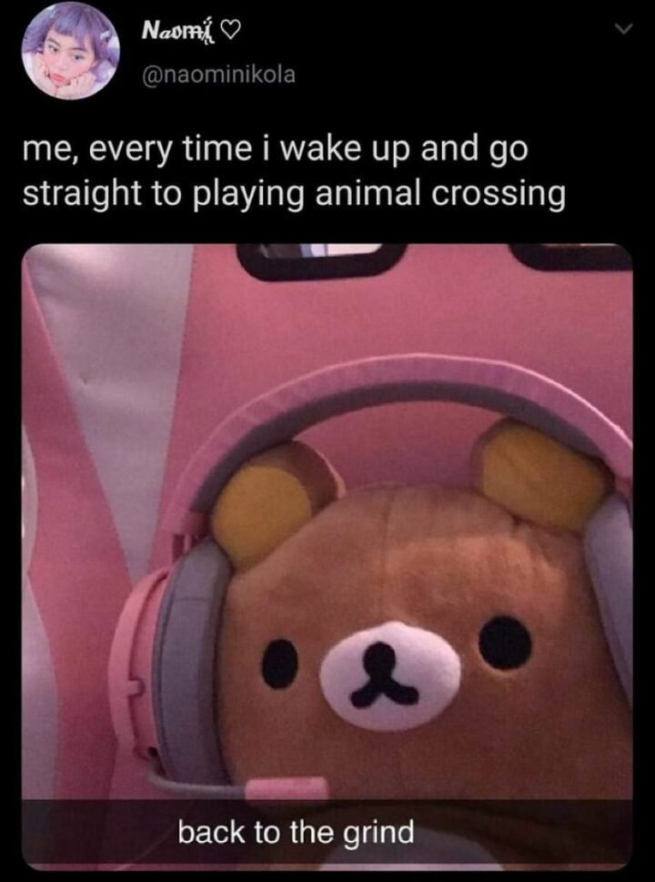 15) “Me, every time I wake up and go straight to playing Animal Crossing: Back to the grind.”