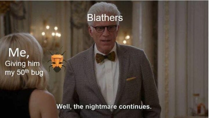19) “Blathers. Me, giving him my 50th bug. Well, the nightmare continues.”