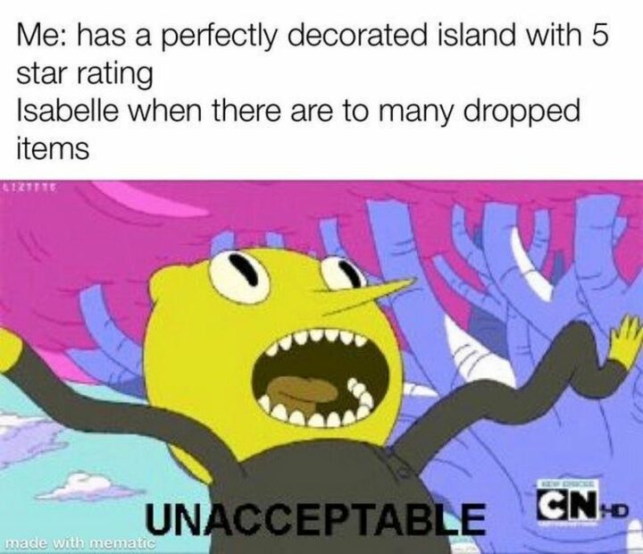 22) “Me: Has a perfectly decorated island with a 5-star rating. Isabelle when there are too many dropped items: Unacceptable.”