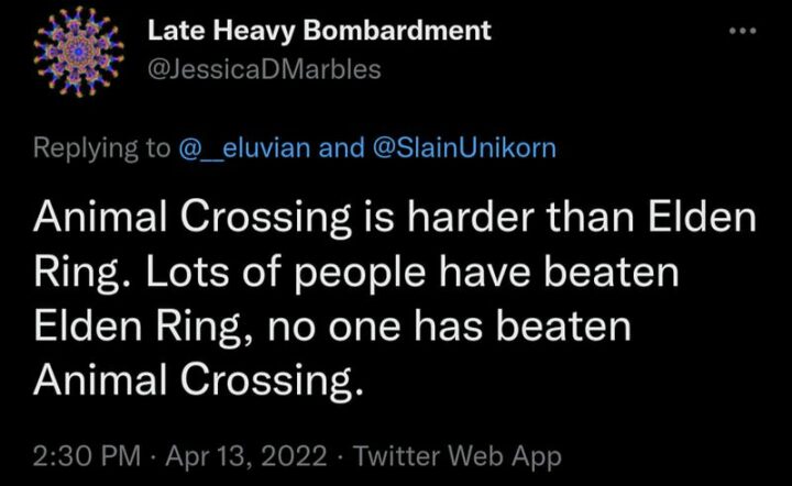 26) “Animal Crossing is harder than Elden Ring. Lots of people have beaten Elden Ring, no one has beaten Animal Crossing.”