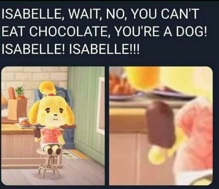 27) “Isabelle, wait, no, you can’t eat chocolate, you’re a dog! Isabelle! Isabelle!!!”