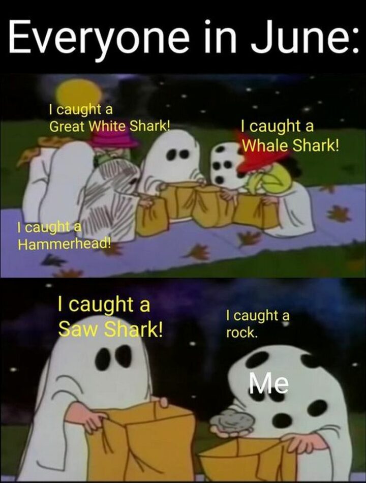 29) “Everyone in June: I caught a great white shark! I caught a whale shark! I caught a hammerhead! I caught a saw shark! Me: I caught a rock.”