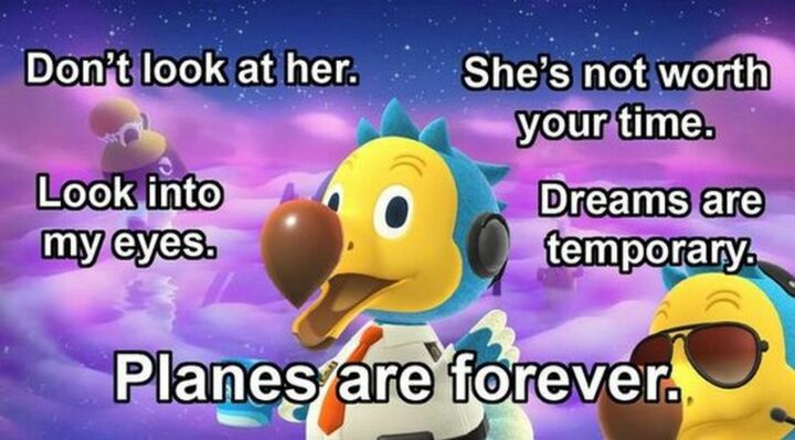 31) “Don’t look at her. She’s not worth your time. Look into my eyes. Dreams are temporary. Planes are forever.”