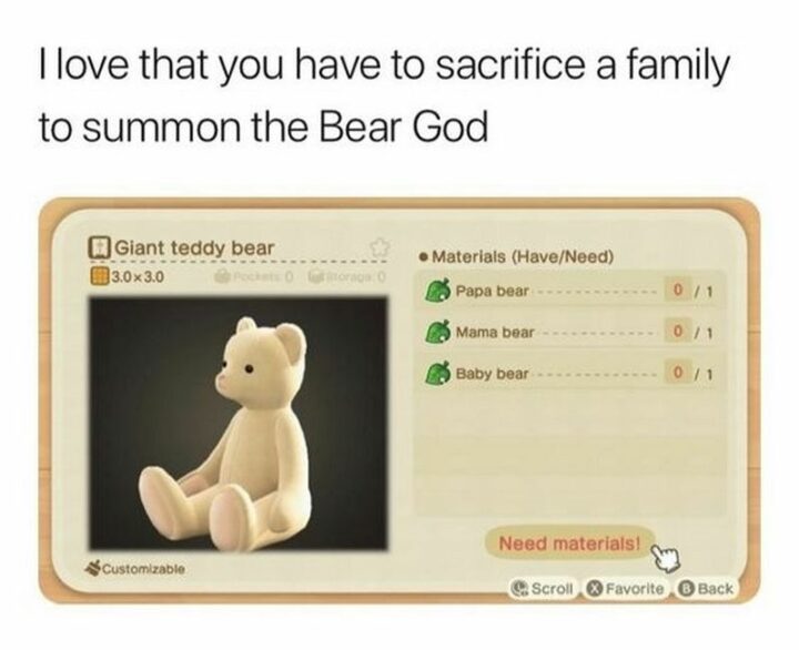 33) “I love that you have to sacrifice a family to summon the bear god: A giant teddy bear.”